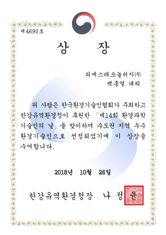 수도권 지역 우수 환경기술인으로 선정되어 표창을 수상하였습니다.