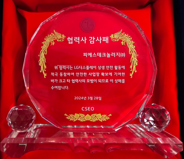 피에스테크놀러지(주)는, 2024년 3월 28일 LG디스플레이로부터 안전관리 우수 협력사로 선정되어